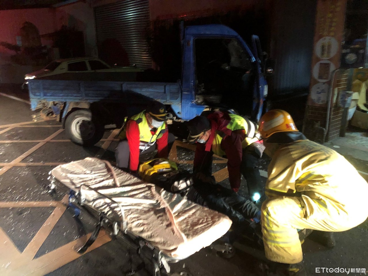 ▲小貨車駕駛為閃避左轉機車,不慎自撞民宅受困車內,消防人員使用破壞器材後,才將邱男脫困送醫。(圖/記者黃孟珍翻攝)