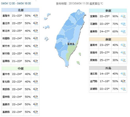另外,中央氣象局表示,4日華南雲雨區東移影響,台灣中部以北及東北部地區有短暫陣雨或雷雨,南部地區有局部短暫陣雨或雷雨,東部及東南部地區有局部短暫陣雨。