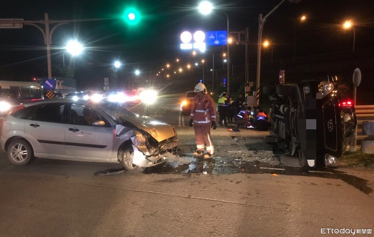 ▲轎車撞翻休旅車,詳細肇事原因與責任仍待調查,以下同。(圖/記者陳雕文翻攝)