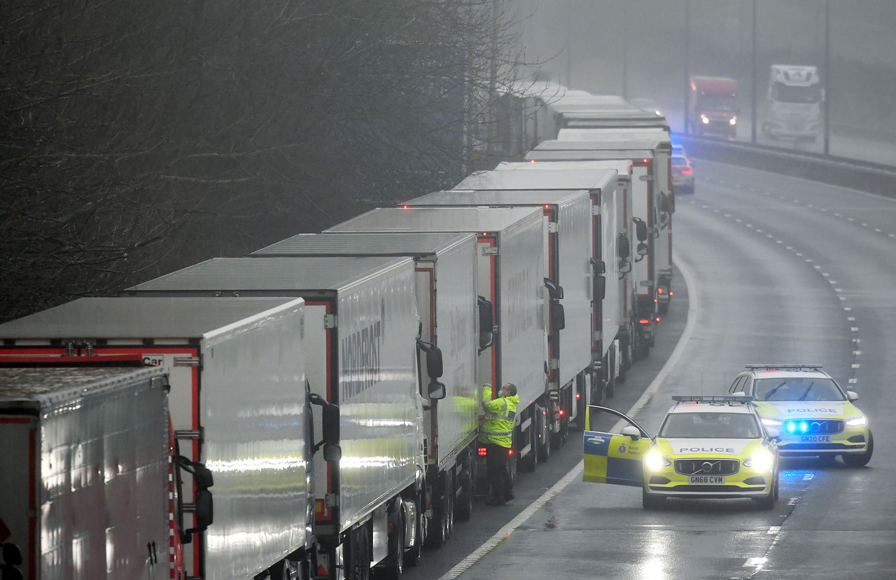 ▲法國日前對英關閉邊境48小時,英多佛港(Dover)數以千計的貨櫃車被堵在路上。(圖/路透)