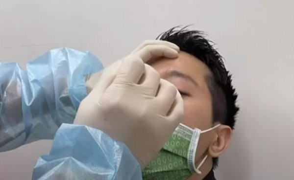 ▲何志偉戴上綠色口罩,仰頭接受鼻咽採檢。(圖/東森新聞)
