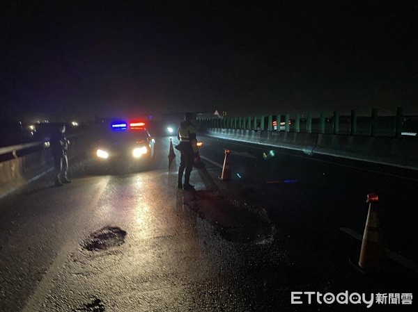 大園分局草漯派出所於昨晚18時30分接獲通報,在台61線高架南下38.1K處外側車道,因連日雨勢及重車輾壓,出現分別為1米至2米長,寬約5-60公分,深約10至15公分的2個坑洞,造成7、8部車輛因視線不良高速通過後爆胎故障。