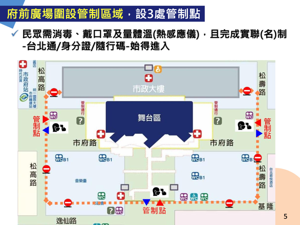 面對跨年防疫,北市府24日下午緊急召開跨年晚會最新防疫措施記者會,台北市觀傳局表示,北市府目前更加強跨年防疫措施,將於31日當天於市府前舞台區圍設管制範圍,於松高路,松壽路及市議會前的1號道路分別設置3處管制點,每處管制點視場地條件設置最多10個出入口供民眾進出,民眾必須量體溫,消毒,戴口罩並做好實聯(名)制始得進入,民眾可透過台北通APP或QRcode或持身分證掃描入場,管制點外設有準備站協助民眾實聯制入場。