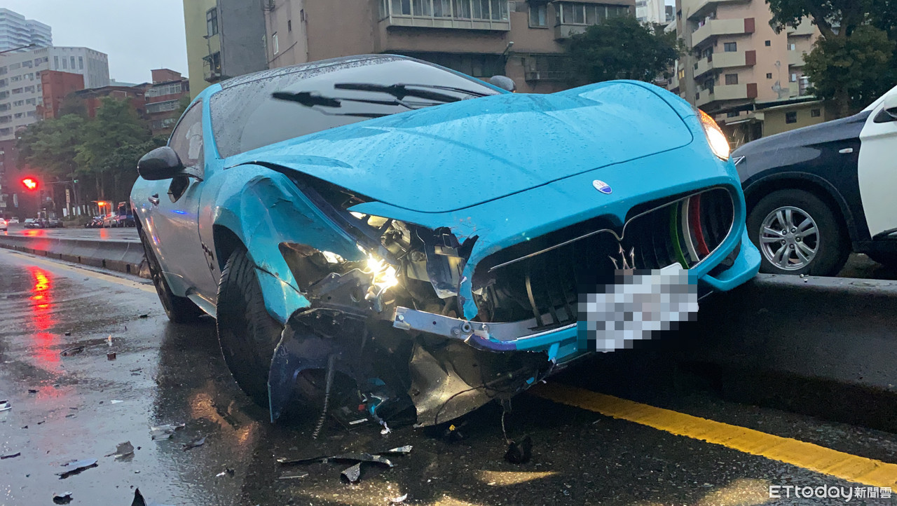 台北市一名男子平安夜狂歡後,25日清晨6時許駕駛瑪莎拉蒂從基隆路一段101巷開出,疑似左轉時沒注意到松隆路中分隔島,整輛車直接撞斷路燈桿後卡在分隔島上,所幸車上2人並無受傷,但新車價約758萬元的瑪莎拉蒂GranTurismo卻嚴重受損,車頭破裂近乎半毀。由於肇事駕駛先行離開,警方正聯繫車主到案說明,以釐清事故原因。