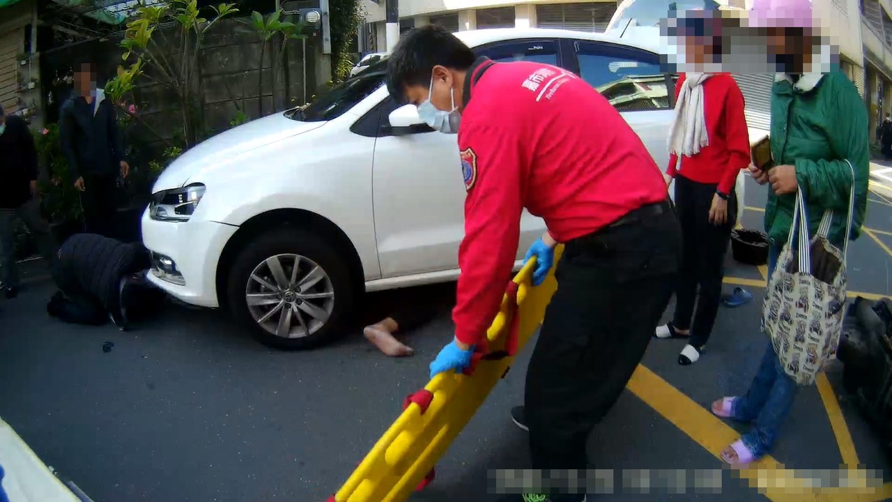 ▲騎士遭壓汽車底下。(圖/記者翁伊森翻攝)