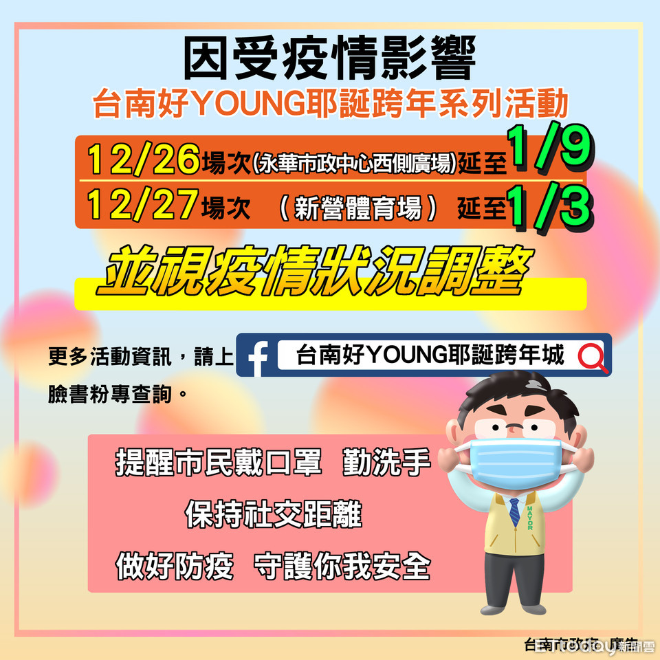 台南市政府新聞處表示,原訂12月26日搖滾嘻哈夜,將延至明年元月9日舉行(永華行政中心西側廣場);12月27日青春流行夜將延至明年元月3日舉行(新營體育場)。