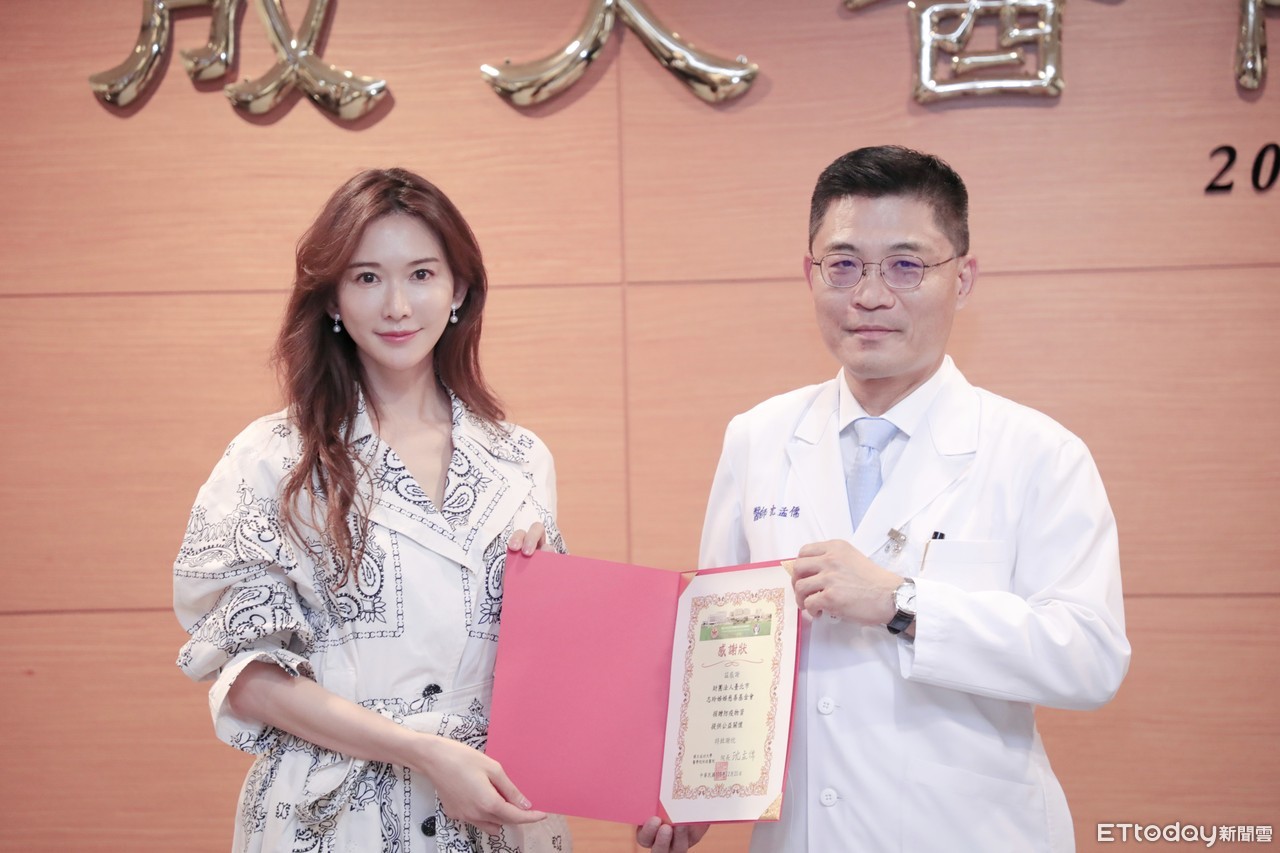 ▲林志玲女士以「志玲姊姊慈善基金會」名義,代表社會善心人士捐贈善款,由成大醫院沈孟儒院長代表接受。(圖/記者林悅翻攝)
