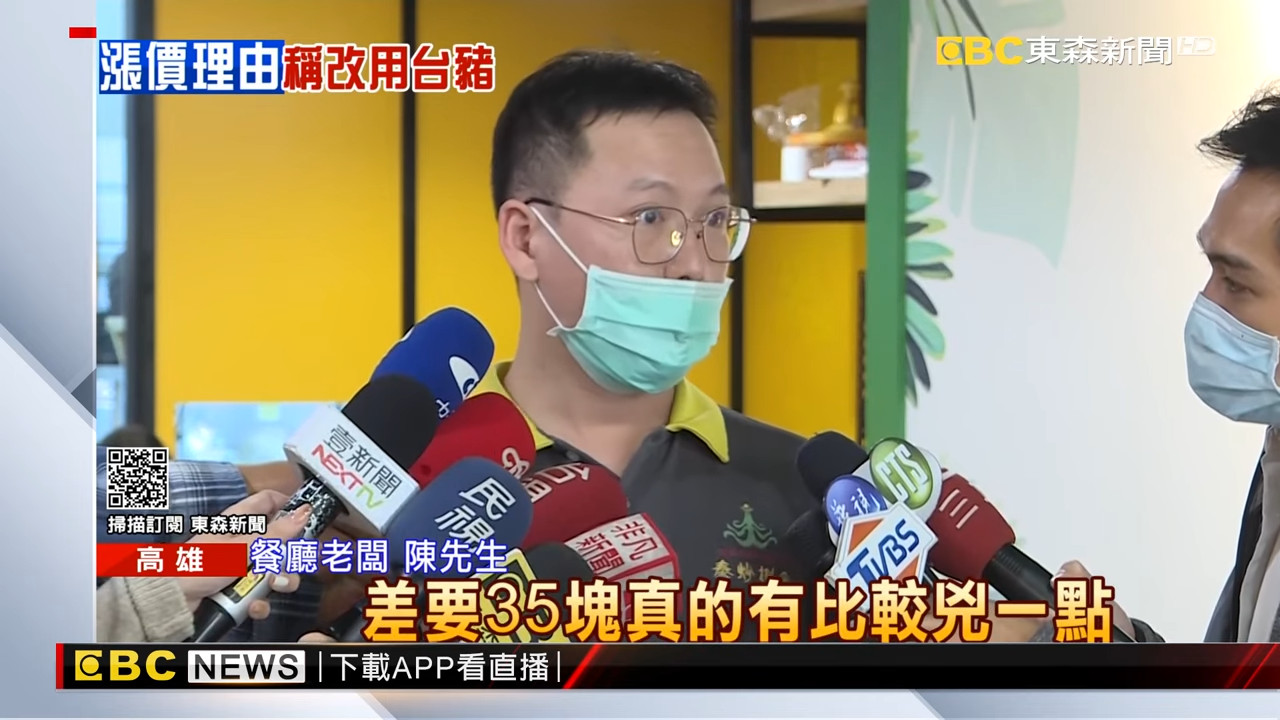 對此,餐廳業者陳睿霈表示,他們之前的豬肉都用加拿大的,每公斤115元,台灣豬每公斤150元,等於成本提高不少,一來一往就差了35元,因此選擇漲價,每道菜約漲5到10元,「差要35元真的有比較兇一點」。