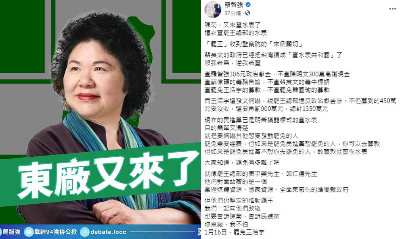 「陳菊,又來查水表了,這次查罷王總部的水表。」羅智強在臉書表示,「罷王」收到監察院的「來函關切」,總統蔡英文的政府已經把台灣搞成「查水表共和國」了,順我者昌,逆我者查。