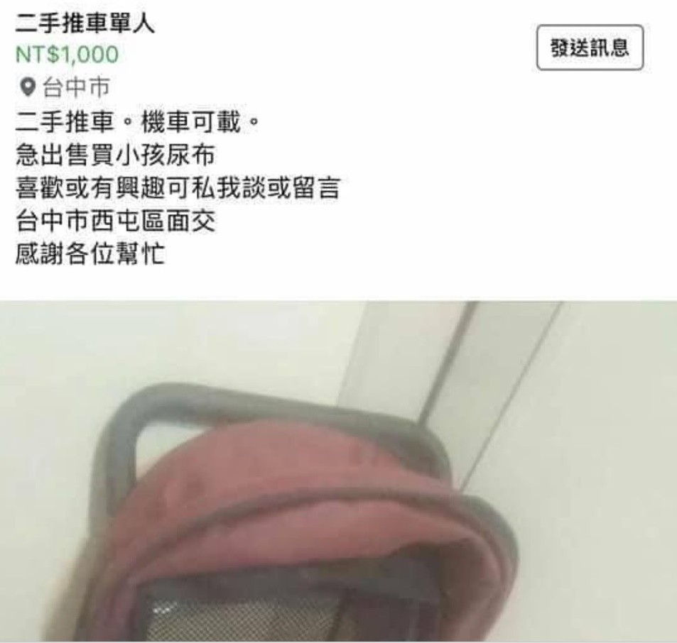 何姓網友早在11月下旬,曾po過文要急售二手推車,為了要買小孩尿布,還說,機車可載,喜歡可私談、面交云云,或許這次又po文,才引起網友熱議。