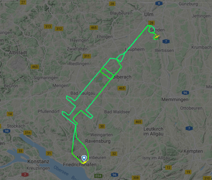 德國20歲飛行員克雷默(Samy Kramer)駕機飛了200公里,在空中製造一個巨大的針筒狀飛行路徑,提醒民眾歐洲已開始2019 冠狀病毒疾病(COVID-19)疫苗接種行動。