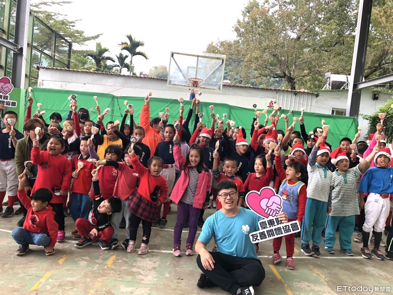 台東縣友善關懷協會同仁藍時能扮演著孩子們期盼的聖誕老公公,在佳節週末帶給孩童們歡樂溫暖的氣息,笑著跟孩子說「聖誕老公公雪橇故障,所以慢到了些,但是從來沒有忘記你們」。