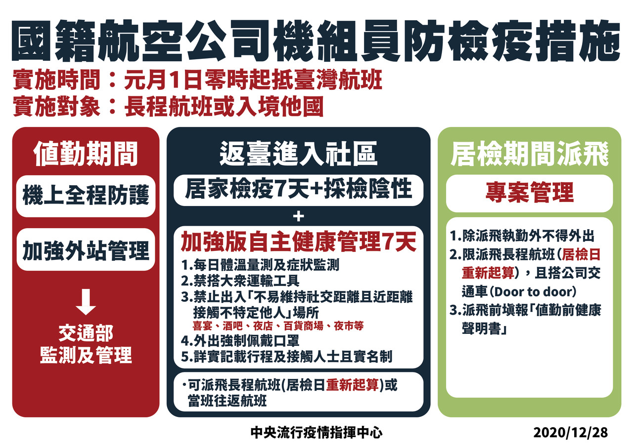 陳時中也再次強調,自主健康管理7天,包括禁止搭乘公共運輸工具、禁止出入人數眾多不易維持社交距離且會近距離接觸不特定人士之場所、外出必須佩戴口罩、機組員也要詳實記錄行程及接觸人士等,相關措施自110年1月1日起實施,民航局及航空公司將透過查核機制進行稽查。