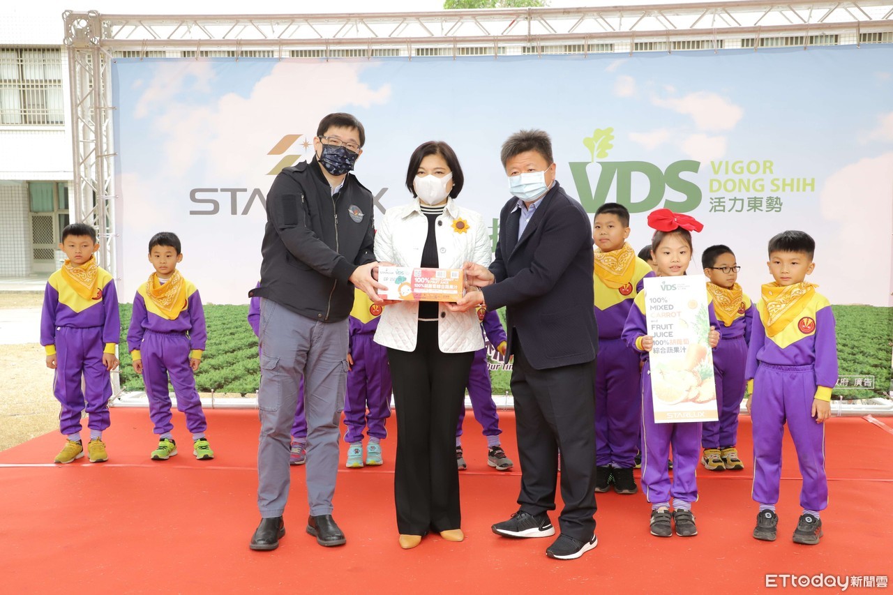 ▲雲林縣VDS活力東勢與星宇航空攜手送暖到雲林,贊助專屬航空機上供應的蔬果汁給雲林縣國小學童。(圖/記者蔡佩旻翻攝)