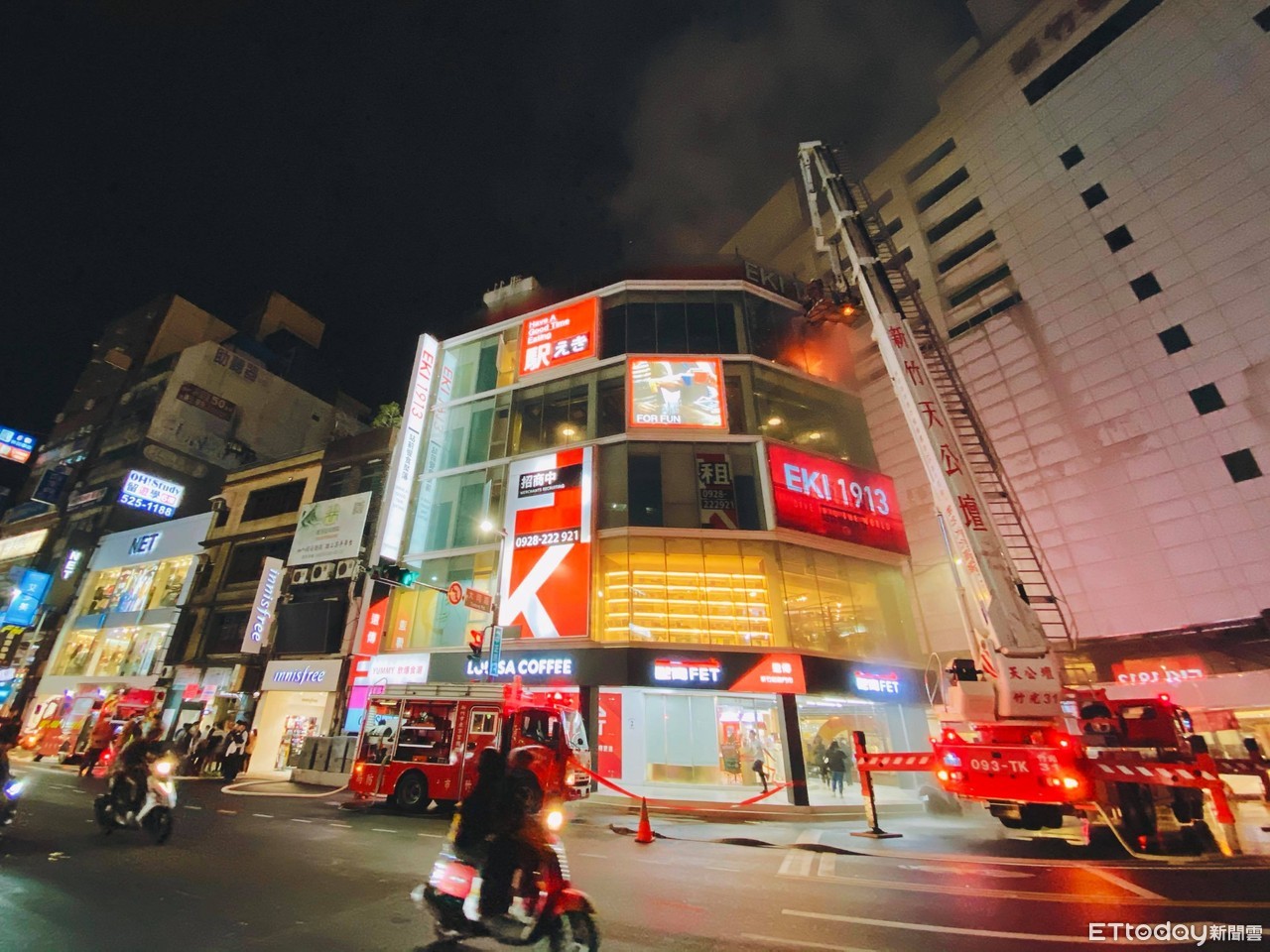 ▲新竹火車站前美食廣場大樓,27日晚間8時許,5樓的燒烤店發生火警,消防局出動雲梯車灌救。(圖/讀者提供)