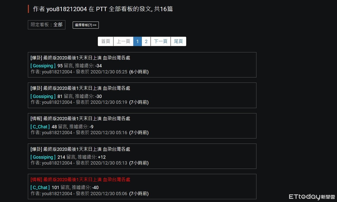 根據檢警調查,PO該恐嚇訊息的用戶:「you818212004」在PTT歷年發文共有16篇,最後5篇「最終版2020最後1天末日上演 血染台灣各處」都在30日凌晨5點分別PO在PTT八卦版以及C_CHAT版,檢警已鎖定該帳號男子身分進行調查,但也不排除該男帳號遭到盜用。