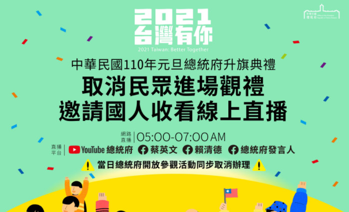 根據總統府因應疫情的最新規劃,元旦升旗典禮流程雖然照常進行,但僅有政府官員暨受邀賓客現場觀禮,取消民眾進場觀禮,國人當天可透過總統府官網、總統府YouTube頻道、總統臉書、副總統臉書,及總統府發言人臉書觀看線上直播,一同以線上方式迎接新年到來。