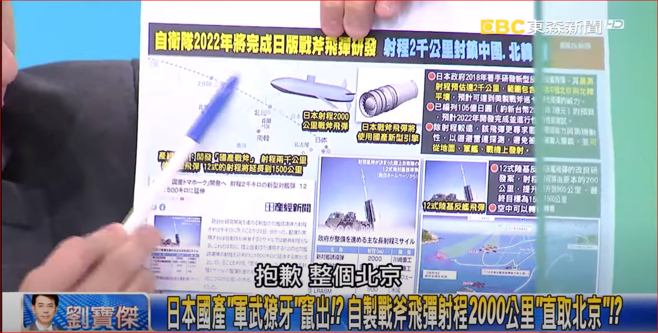主持人劉寶傑質疑,日本《產經新聞》報導指出是「對艦飛彈」,但是「對艦飛彈」需要打2000公里嗎?在日本海附近,有什麼目標需要這麼大手筆、發展這麼昂貴的飛彈?