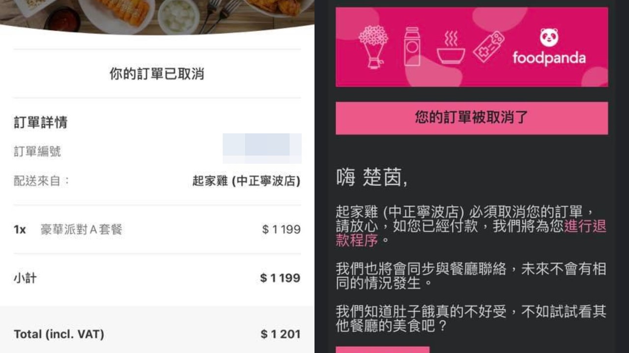 從林楚茵截圖的訂單看到,林楚茵上午在知名炸雞連鎖店「起家雞」中正寧波店訂好餐點,總計1201元,送出訂單後,卻收到熊貓系統通知「取消訂單」,若已付款會進行退款程序。