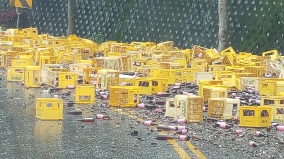 回顧事發經過,31日下午一輛滿載紅標米酒的大貨車,沿舞鶴山南下大彎道行駛時,疑似貨物沒有綑綁確實,加上車速、彎道等因素,裝在黃色箱子內的米酒瞬間連瓶帶箱,一箱箱被甩落路面,影響用路人通行。