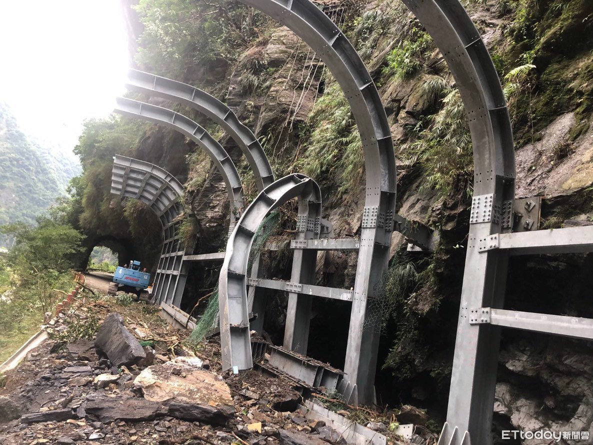 ▲防落石棚工程因連日降雨,部分工程設施被落石擊毀,迫使工程往後展延。(圖/太管處提供)
