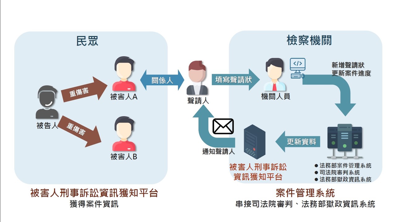 未來特定類型案件的被害人,或3親等內親屬,可向地檢署申請專屬帳號,凡是被告遭羈押、交保等強制處分,偵查結果,通緝情形,甚至是起訴後法院開庭、定期宣判等訴訟程序訊息,都會以e-mail通知被害人。