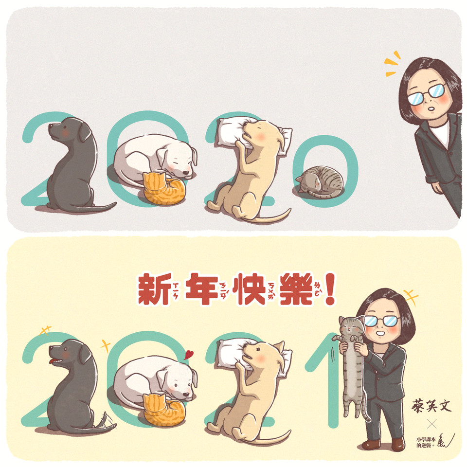 2020年已到尾聲,總統蔡英文31日在社群平台發布與「小學課本的逆襲」聯名之2021年跨年賀圖,賀圖畫出蔡總統抱起愛貓蔡想想的樣子,其他4隻毛小孩也超萌同框,提早祝賀大家新年快樂。