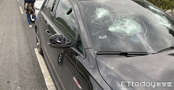 ▲BMW男起飛砸車,黑車車窗受損。(圖/記者許力方翻攝)