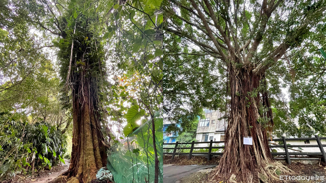 ▲新店區十四張新增列管珍貴樹木「黑板樹」(左);鶯歌區重慶橋上游停車場內新增列管珍貴樹木「榕樹」(右)。(圖/新北市農業局提供,下同)
