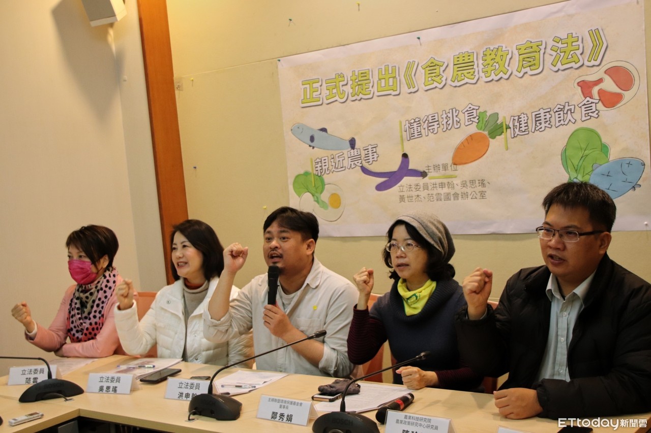 民進黨立委洪申翰、吳思瑤、范雲、黃世杰5日上午與主婦聯盟環境保護基金會、農業科技研究院,於立法院召開「提出《食農教育法》,了解『從農場到餐桌』健全食安體系」記者會,呼籲行政與立法部門應盡速完成食農教育立法,完備食安教育與認知普及,並說明共同提出之《食農教育法》草案內容及重點。