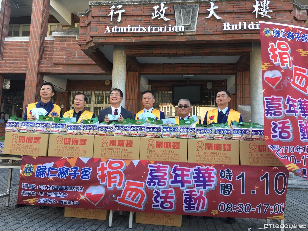 ▲台南市歸仁獅子會會長長邱明財、捐血主席薛俊忠及獅兄、獅姊一行人,共同邀請鄉親10日到新豐高中參加捐血活動。(圖/記者林悅翻攝)