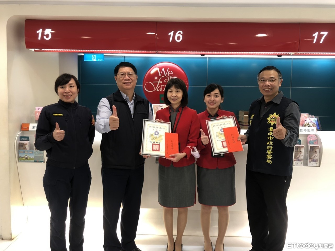▲台南市警二分局長許坤田,偕同偵查隊隊長及轄區派出所所長,前往攔阻有功之金融機構,頒發感謝狀予有功主管及行員。(圖/記者林悅翻攝,下同)