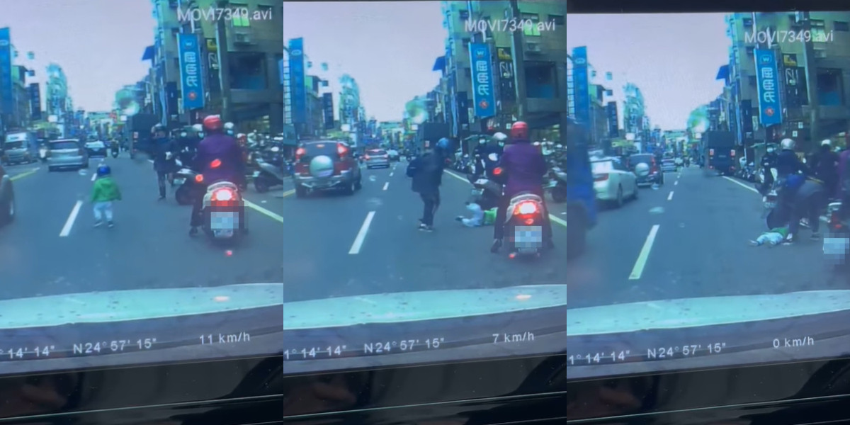 一名女駕駛在臉書《爆廢公社公開版》貼出一段驚魂影片,當時開到某路段,突然一位身穿綠外套的小小孩,突然往馬路直衝,甚至快跨越一個車道,嚇得她急踩剎車,而前方的騎士也趕緊急煞。