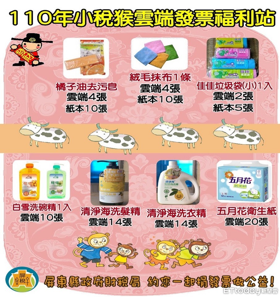 屏東縣政府財稅局邀請民眾一起購物消費使用載具儲存雲端發票,並提倡捐贈雲端發票愛心滿滿做公益,在總局及三分局辦理「小稅猴」雲端發票福利站活動,111日起提供衛生紙及清潔用品等限量家用品供民眾兌換,並受理手機條碼申辦、載具歸戶、設定匯款帳戶。