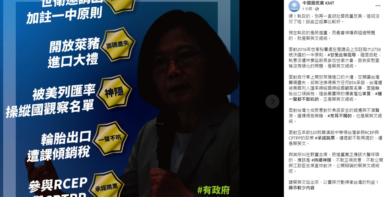 國民黨指出,面對2016年世衛秘書處在邀請函上加註聯大2758號決議的一中原則,甘受此等屈辱,卻宣稱沒有矮化的問題,是蔡英文;面對自行奉上開放萊豬進口,甘願讓台灣籌碼盡失,卻無法換得美方任何BTA承諾,甚至台灣還被美國列入匯率操縱國觀察名單,面臨輪胎出口傾銷稅,但連一聲都不敢吭的,正是蔡英文。