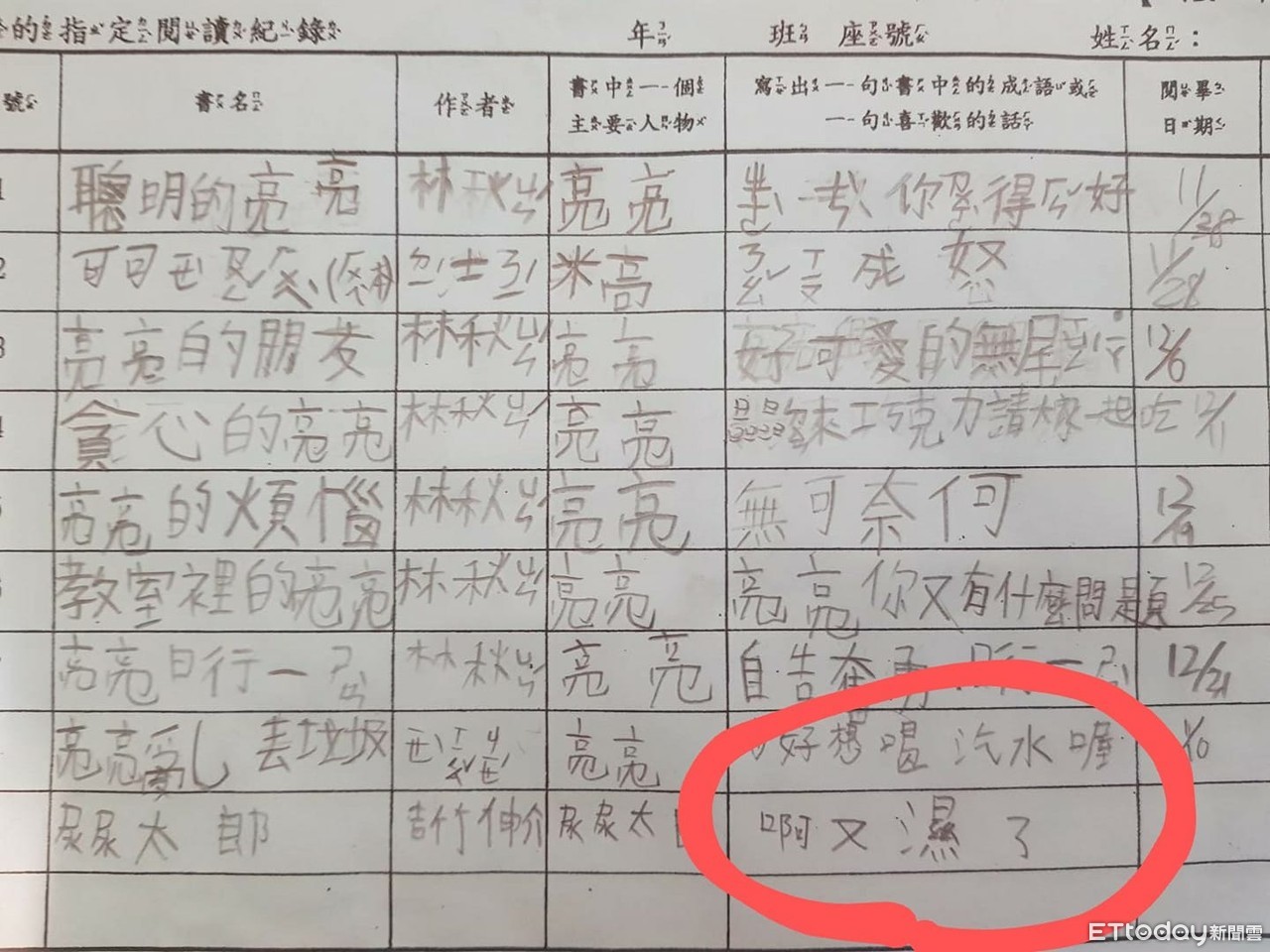 由於要寫下閱讀紀錄,包括閱讀書名、作者、書中人物,以及文中的成語或喜歡的話,所以弟弟也童言童語地記下來;沒想到,在《尿尿太郎》裡最讓他印象深刻的一句話,竟是「啊又濕了!」