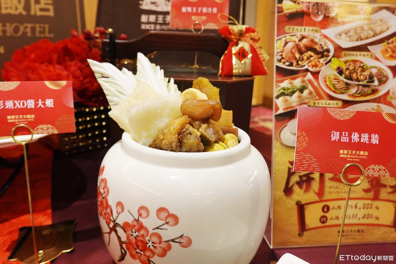 至於年節最暢銷的《御品佛跳牆》(含甕一盅3,680元),主廚嚴選北海道干貝、加拿大烏參、花膠魚肚、栗子、北菇、土雞等十餘種山珍海味入甕費時熬煮,作工繁瑣,湯頭鮮甘讓人回味無窮,是年節必備美味佳餚。整組採購就送這道湯品,保證物超所值。年菜外帶即日起至2021年2月11日接受訂購,1月31日前訂購再加贈耐斯王子保溫保冷袋。