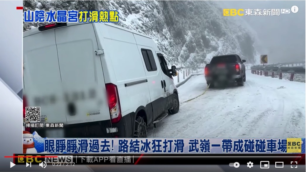 寒流讓合歡山下大雪,吸引許多追雪族。不過在台14甲線武陵段陡峭難行,在路面結冰的情況下相當容易打滑,被稱作是「水晶宮」。11日一輛3.5噸重的露營車爬到一半雪鍊斷掉,拖吊業者開價4000元,駕駛不滿業者哄抬、直接賴在路中間不走。最後還是後面的駕駛看不下去,直接幫露營車駕駛出1000元,解決這場鬧劇。