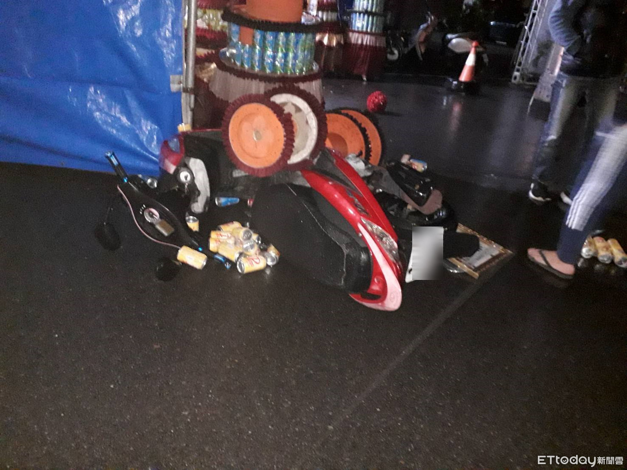 ▲苗栗通霄一名44歲李姓騎士因下雨視線不佳加上酒駕,意外撞倒喪家罐頭塔。(圖/記者黃孟珍攝)