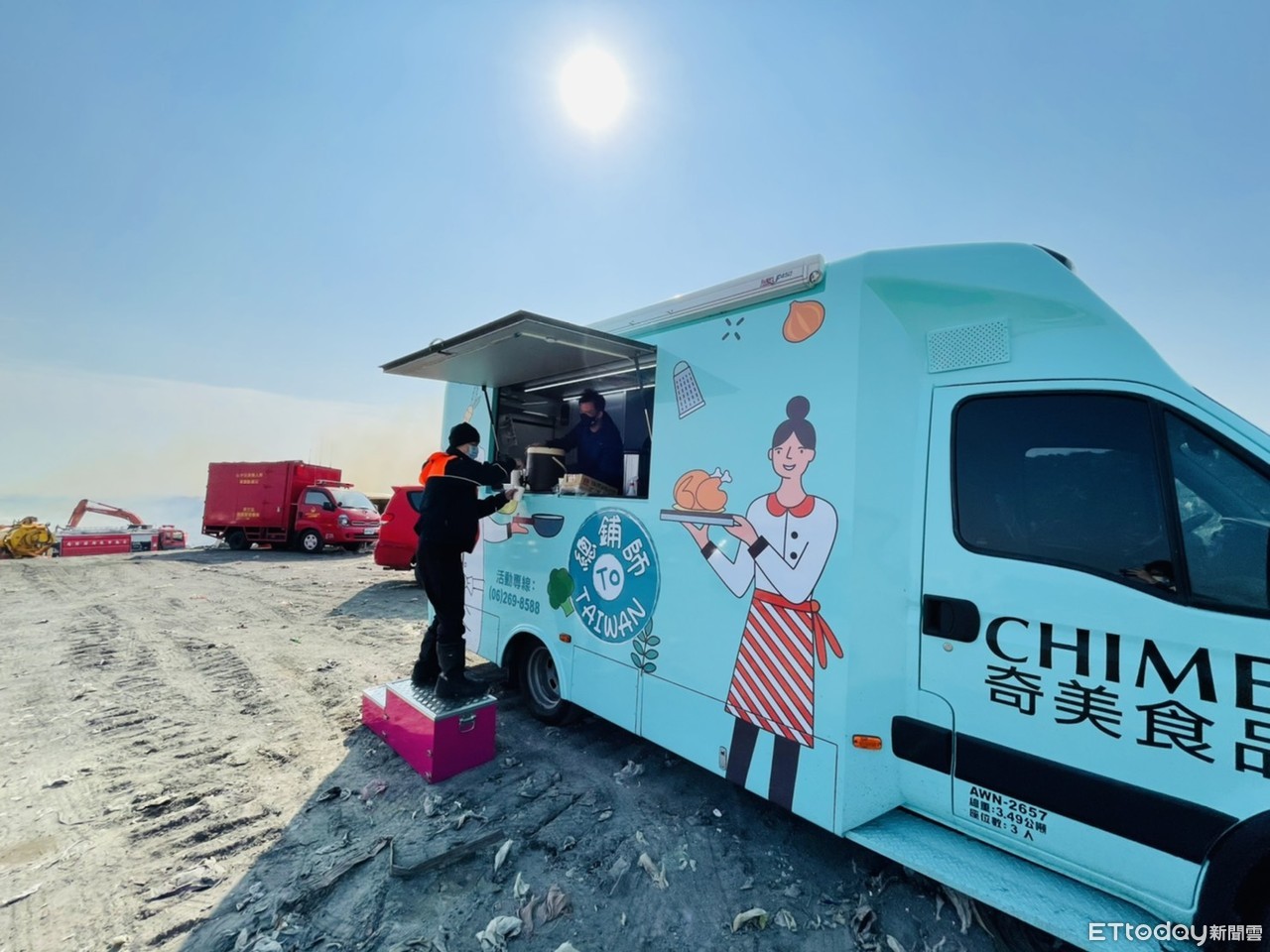 奇美食品股份有限公司於12日得知台南市消防人員徹夜救火,一早主動出動熱食餐車「總鋪師」至救災現場,除提供熱騰騰的包子外,另準備薑茶及咖啡等熱飲,讓身處在天寒地凍的消防救災人員,在救災上備感溫暖。