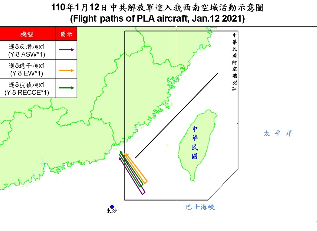 國防部公布的資料指出,2021年至今總計15架次共機擾台,包括:1月2日運8技術偵察機1架次;1月3日運8反潛機1架次;1月4日運8遠干機1架次、運8反潛機1架次、運8技術偵察機1架次、運9通信對抗機1架次;1月5日運8遠干機1架次;1月6日運8反潛機1架次、運8遠干機1架次;1月7日空警500機型1架次;1月9日運8反潛機1架次;1月11日運8技偵機1架次;1月12日運8反潛機1架次、運8遠干機1架次,及運8技術偵察1架次。