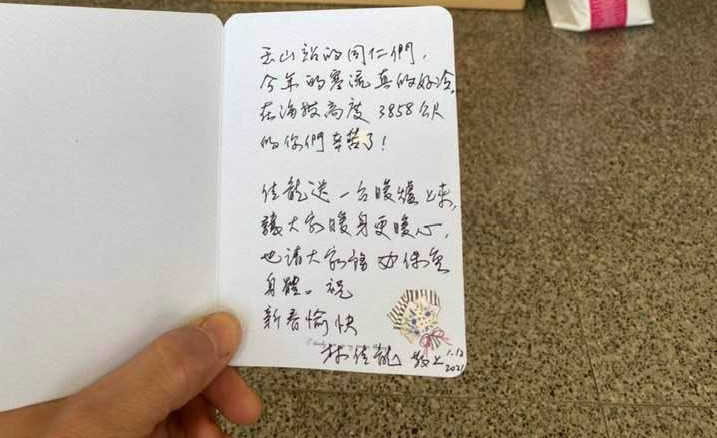 鄭明典13日晚間在臉書表示,同事稍早傳來照片,「行動派的部長已經請人將冬季補給品送到嘉義站了,就等運補時間一到,東西就會送上玉山北峰測站!先代北峰站同事感謝部長!」