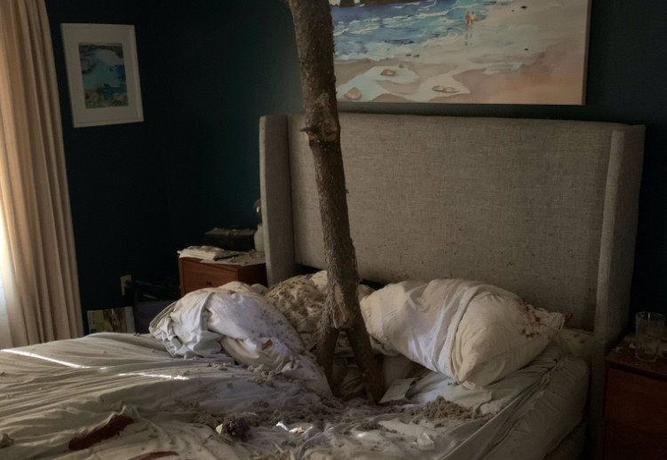 根據《太陽報》報導,華盛頓州一名婦人1月13日凌晨和丈夫在房間內熟睡時,屋外突然颳起狂風,而路邊一棵大樹竟不敵強風,其中一段樹枝應聲斷裂,直接倒向婦人的家;更恐怖的是,粗大的樹枝竟直接穿破天花板,筆直地插進雙人床裡,婦人也被死死地壓住。