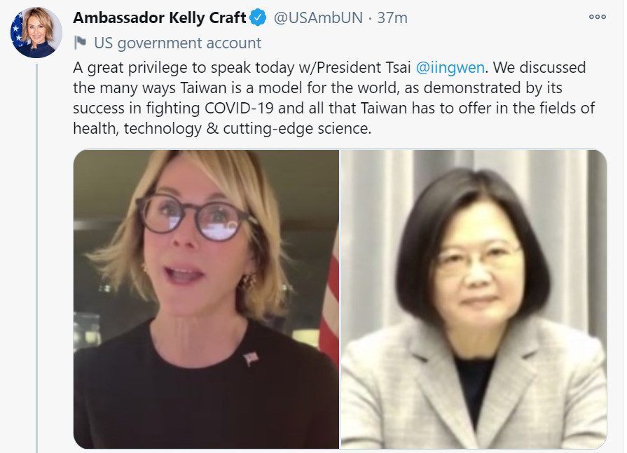 ▲美國駐聯合國大使克拉芙特(Kelly Craft)證實與總統蔡英文談話。(圖/翻攝自推特)