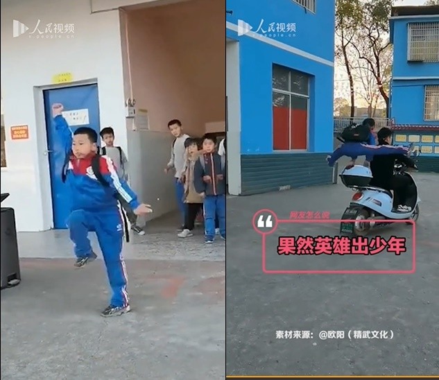 綜合陸媒報導,阿彪今年上五年級,學武術約有一年多。當天放學時,阿彪下樓後,先來個橫向側空翻,將垃圾丟入垃圾桶,隨即展示一套剛學的組合拳,緊接著連續四個後手翻,最後一躍上電動車,帥氣身影讓在場所有人目瞪口呆。