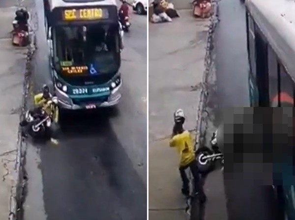 巴西美景市(Belo Horizonte)發生一起可怕車禍。54歲摩托車騎士載著女伴出遊,疑似為了快速通過而鑽車縫,卻不慎自摔。他幸運躲過一劫,但站起身後,發現後座女伴已遭公車輾斃,崩潰抱頭哀號。驚悚的意外過程全被監視器拍攝下來。