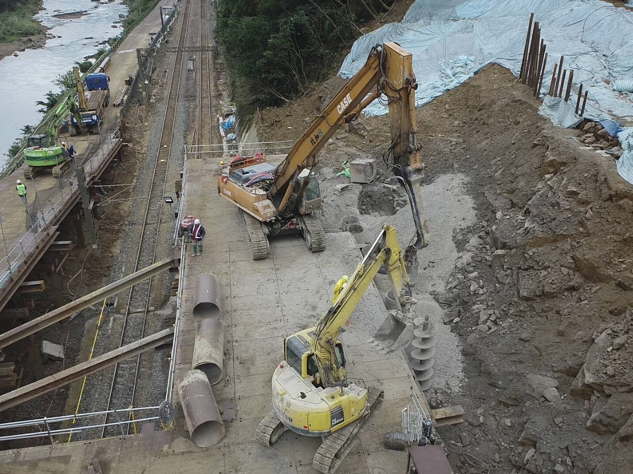 現已完成施工構台組裝,刻正進行主要排樁擋土牆之全套管基樁施作,在工法、工序均已安排妥當下,工程進度符合規劃控管目標,預計可在2月5日前完成排樁擋土牆以防止邊坡滑動,之後進行西正線軌道整正、號誌調整及電車線架設等,致力於2月8日達成搶通西正線恢復雙線雙向通車之目標。