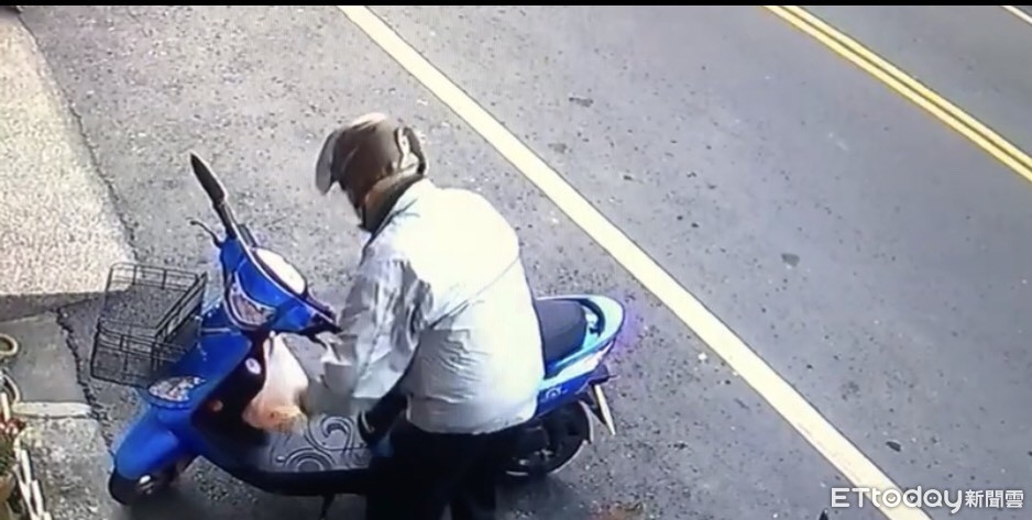 ▼阿伯轉身尋找鑰匙後,渾然忘了豬肉掛在另輛機車上,逕自騎上自己的車返家。(圖/民眾提供)