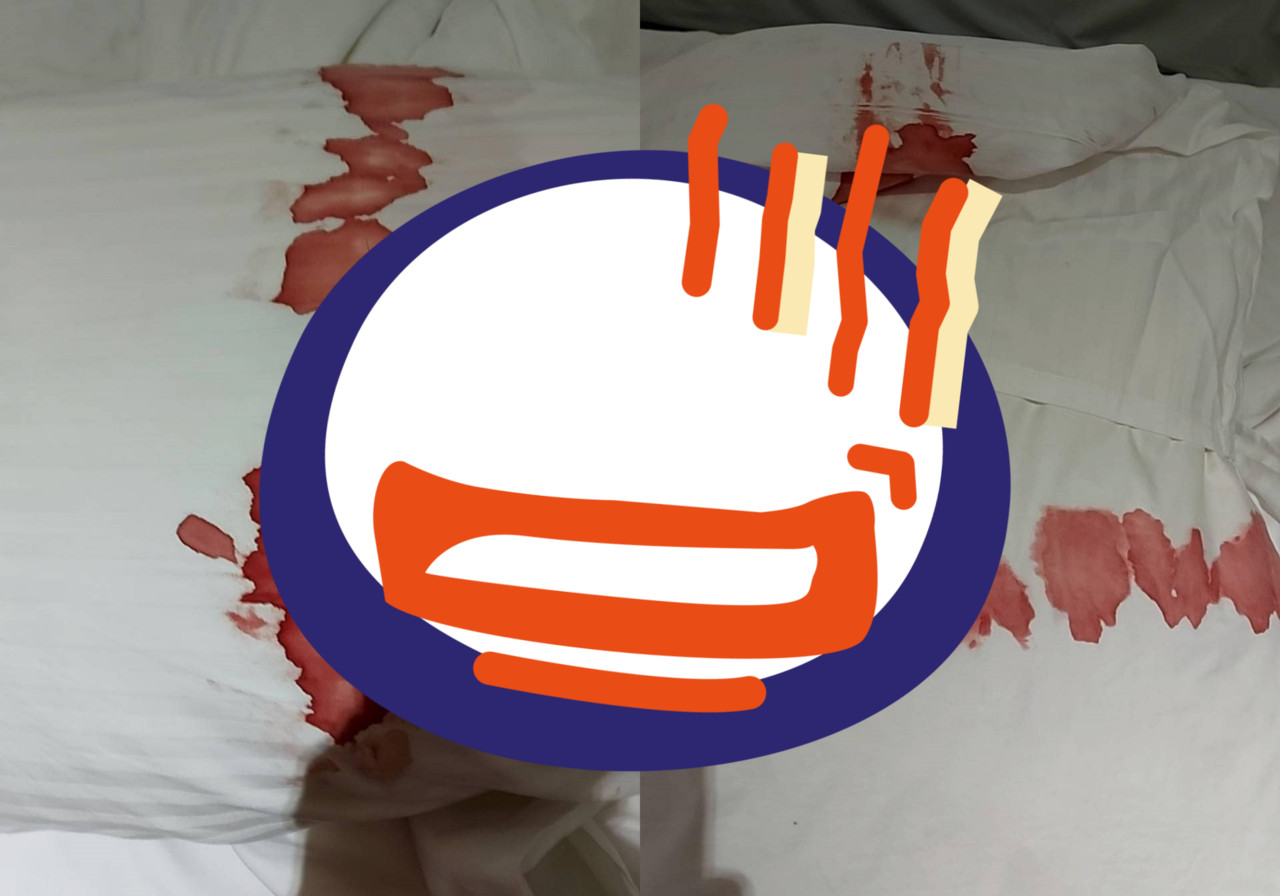 原PO在臉書「爆怨公社」發文,稱身為櫃檯工作人員的自己,想抱怨一下客人的素質。她公佈的照片中可以看到,白色的床單上沾滿大片紅色血塊,連枕頭也都有,畫面觸目驚心。