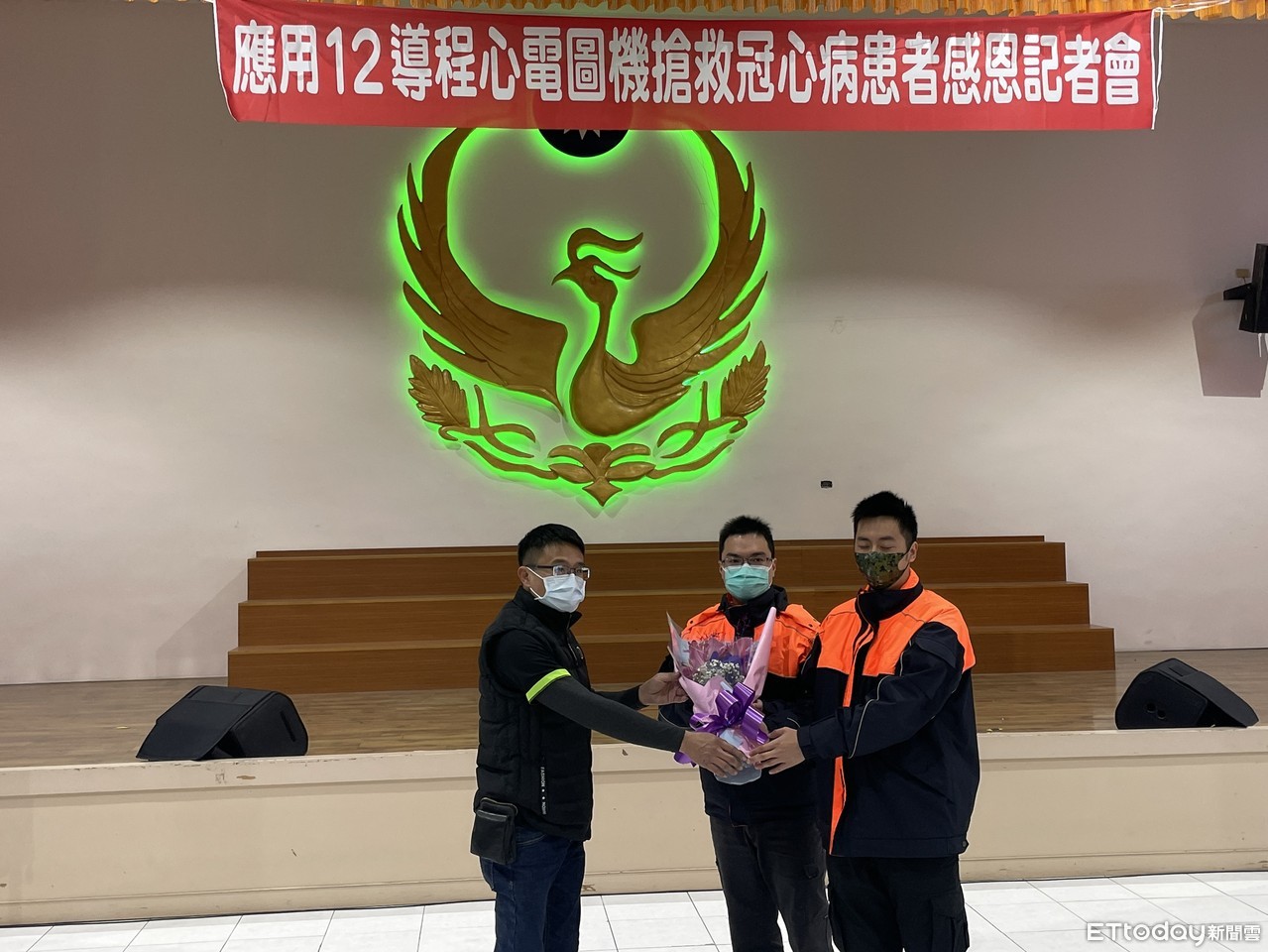 台南市消防局18日舉辦應用12導程心電圖機搶救冠心病患者感恩記者會,邀請經由119救護車載送疑似冠心病患者送醫救治而重獲新生的病患,現身感謝救護人員及時從鬼門關拉回,肯定消防局執行到院前12導程心電圖系統工作的成效。